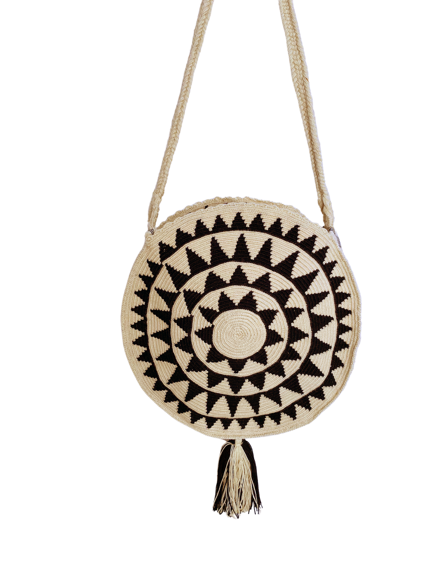 Carry around your essentials all day in this beautiful handmade round handbag by Wayuu artisans. The unique shape and intricate patterns are significant in the Wayuu culture, making it not just a stylish accessory but also a meaningful one.